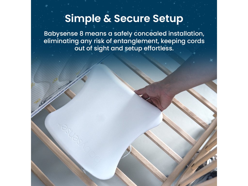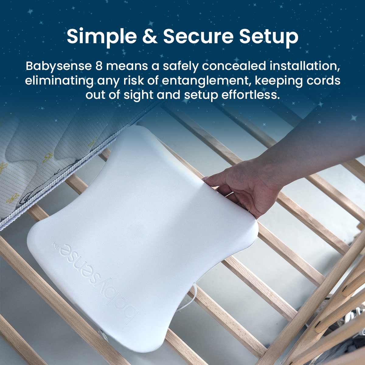 Babysense 8 vám dává klid, že je vaše dítě v bezpečí – každou noc i každý den. Detekuje apnoe a upozorní vás, pokud vaše dítě potřebuje vaši pomoc. Perfektně přizpůsobené vaší matraci a postýlce. Nová generace senzorů! Ultratenké. Ultrapřesné. Extrémně citlivé senzory detekují i ty nejmenší dýchací pohyby s ještě větší přesností a spolehlivostí. Nová generace ultratenkých senzorů se ještě lépe přizpůsobí vaší matraci, postýlce. Babysense 8 nabízí naprostou bezpečnost bez kompromisů. Babysense 8 funguje perfektně se všemi pěnovými, kokosovými, latexovými a prodyšnými matracemi.